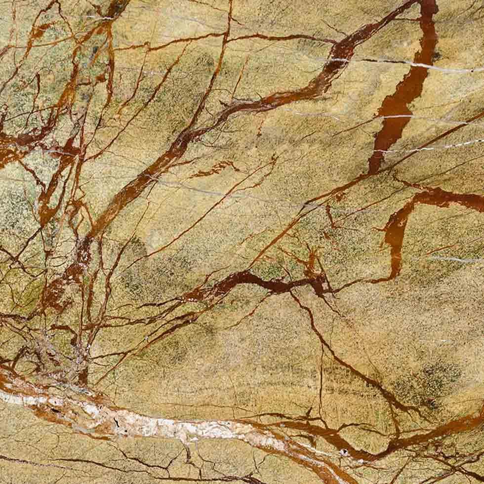 Rainforest Gold Marble is a marble with an incredible gold base with brown root-like strokes. It is highly durable and heat resistant. It is a starch-proof stone and comes in various sizes and thicknesses.