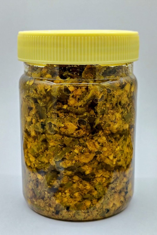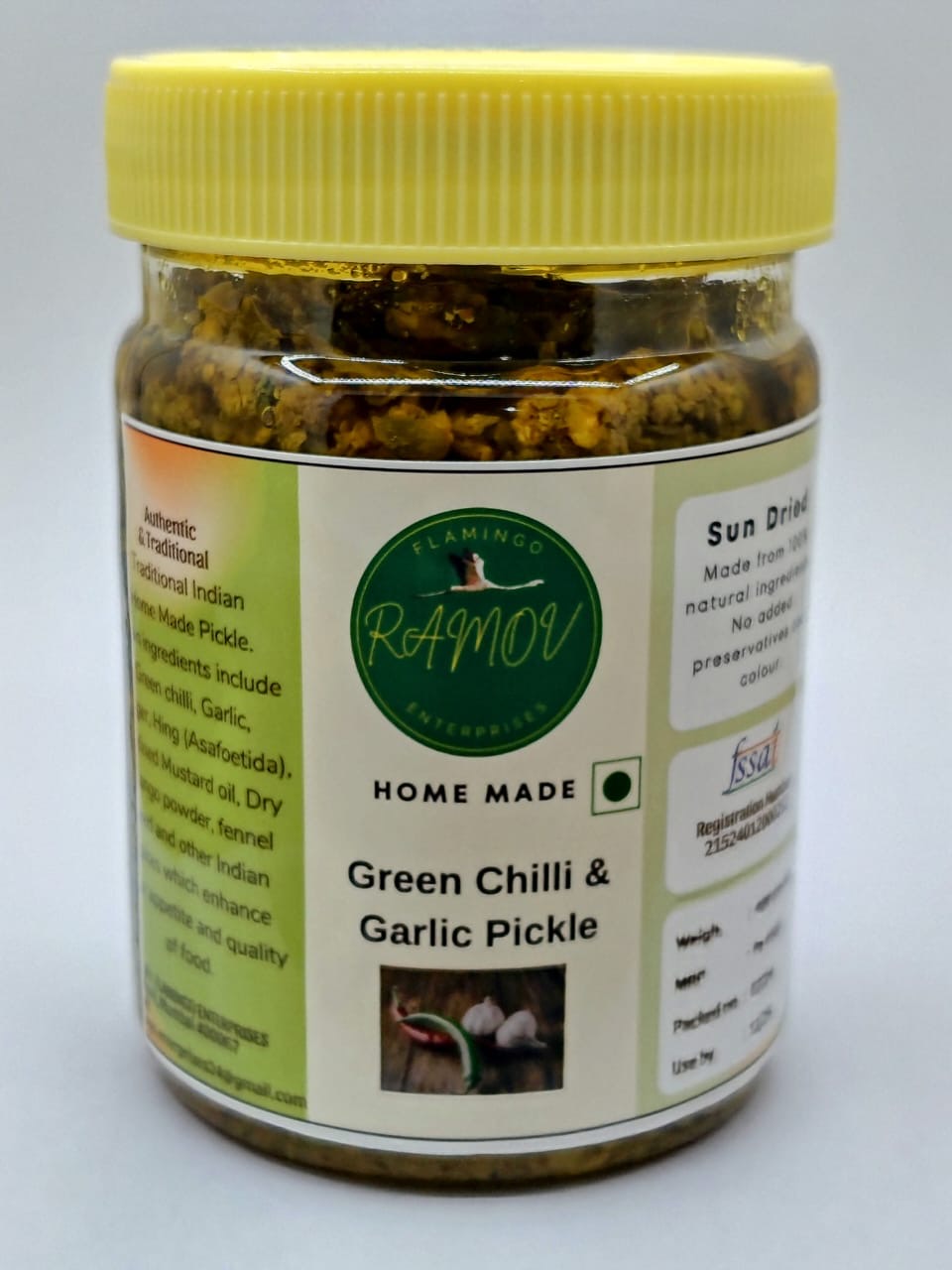 | Ingredients | Green Chilli, Garlic, Ginger, Hing (Asafoetida), Refined Mustard Oil, Dry Mango Powder, Fennel Seed And Other Indian Spices. |