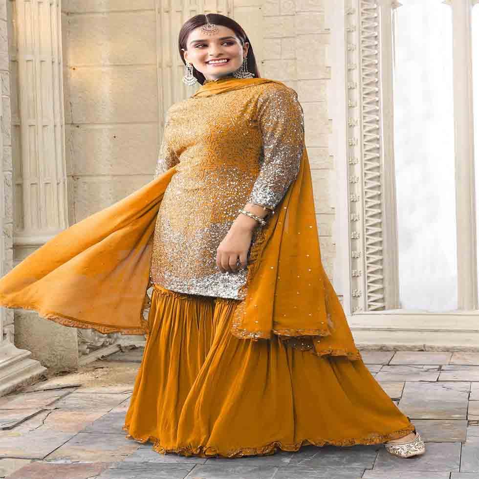 Gharara Dress is a wise option. It is perfect for mehendi and haldi for bridesmaids. In contrast to other ensembles that might require a little effort, this is light and comfortable for movement. Additionally,